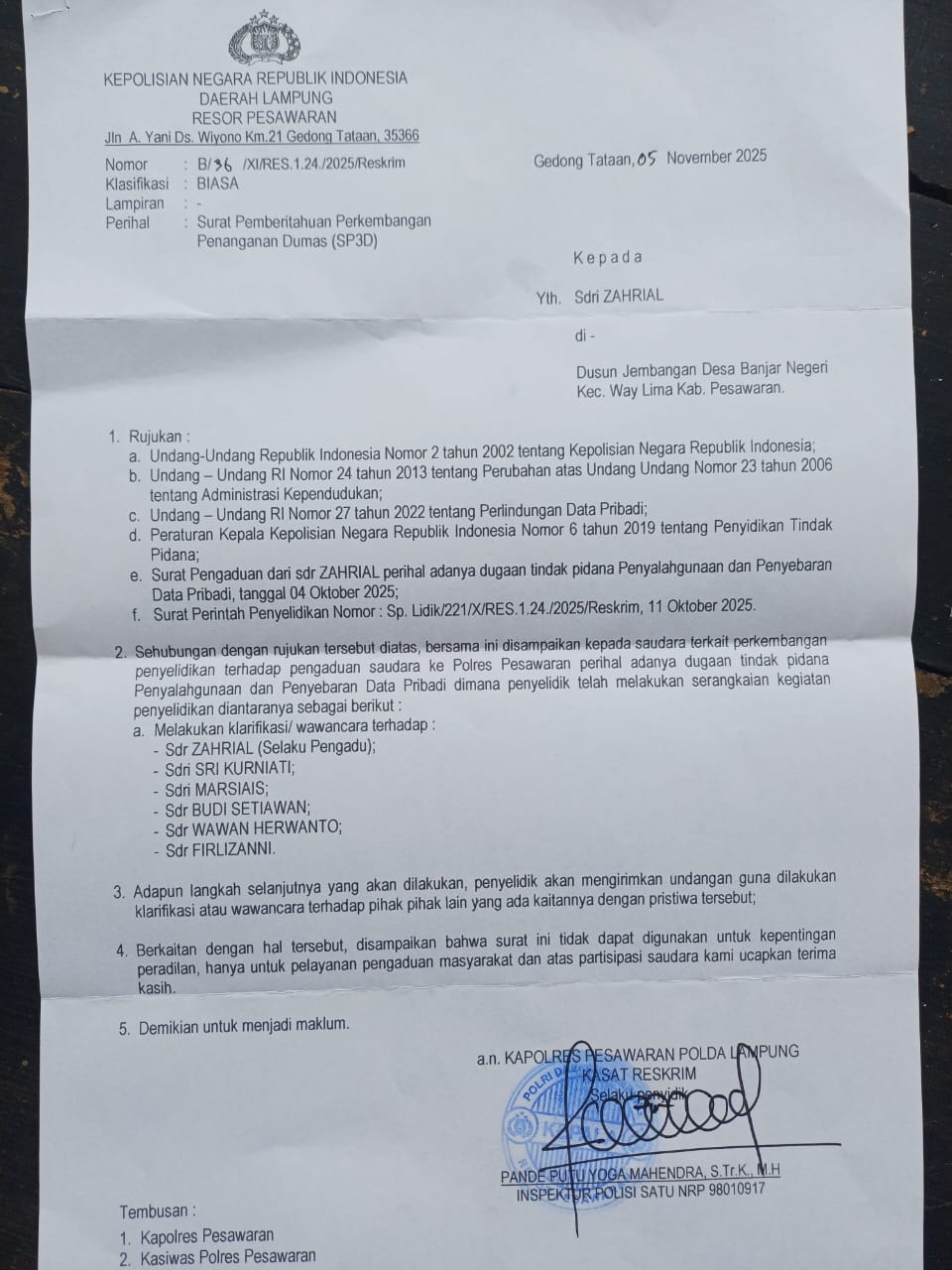 Pesawaran — Kepolisian Negara Republik Indonesia Daerah Lampung Resor Pesawaran melalui Satuan Reserse Kriminal (Satreskrim) telah menerbitkan Surat Pemberitahuan Perkembangan Penanganan Dumas (SP3D) Nomor: B/136/XI/RES.1.24./2025/Reskrim atas laporan Zahrial, warga Dusun Jembangan, Desa Banjar Negeri, Kecamatan Way Lima, Kabupaten Pesawaran, terkait dugaan tindak pidana penyalahgunaan dan penyebaran data pribadi.