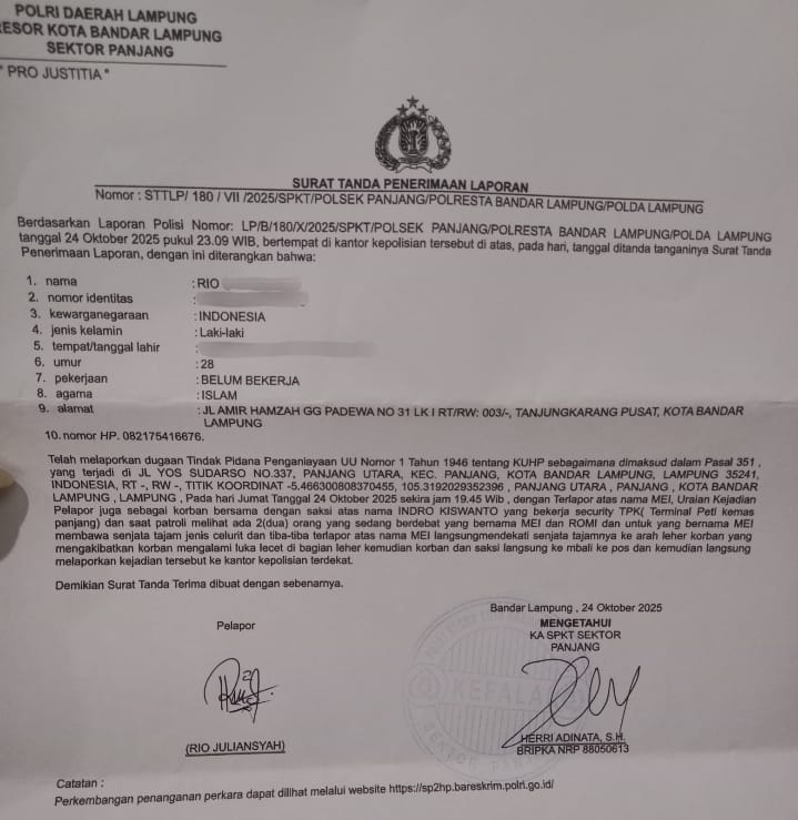 Atas insiden ini, korban melaporkan kejadian tersebut ke Polsek Panjang. Laporan telah diterima dengan nomor LP/B.180/VII/2025/SPKT/POLSEK PANJANG/POLRESTA BANDAR LAMPUNG, tertanggal 24 Oktober 2025.